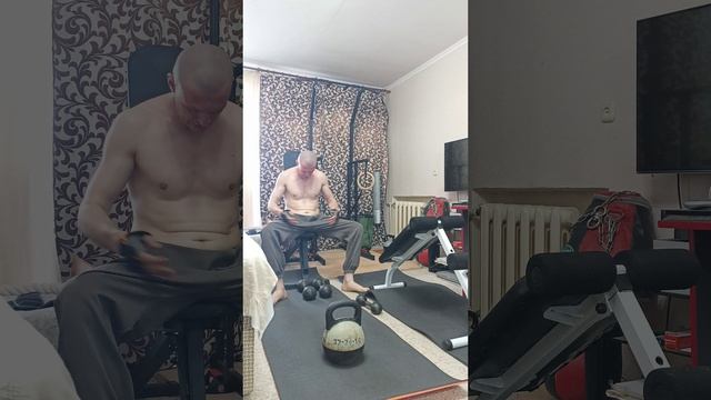 1 круг - 5 подтягиваний (каждый круг - разный хват), 5 махов двумя руками 16 кг гирей, 5 отжиманий на брусьях, 5 армейских жимов 10 кг гантелями сидя на лавке, 5 горизонтальных подтягиваний на кольцах, 5 приседаний с выпрыгиванием, 5 отжиманий и 5 скручиваний на пресс с 5 кг гантелью на лавке. 04:52 - сделал лишний мах гирей 29:32 - сделал лишнее отжимание 35:42 - не сделал пятое скручивание 42:29 - сделал лишний мах гирей 56:09 - сделал лишнее горизонтальное подтягивание на кольцах 61:55 - сделал лишний армейский жим