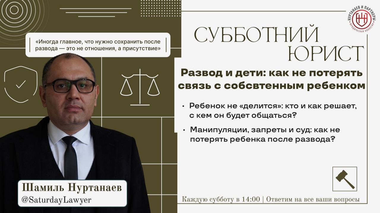 Сегодня 4 апреля в 14:00 вы узнаете ответ на этот и на многие другие вопросы у "Субботнего Юриста" ⚖️ Эфир проведет юрист с более, чем 20 летней практикой – Шамиль Нуртанаев (https://nurtanaev.ru/shamil-ramazanovich-nurtanaev/) (нажав на имя вы можете узнать о юристе больше). 📝 Вот основные вопросы, которые мы обсудим в эфире: 1. Ребенок не «делится»: кто и как решает, с кем он будет общаться? 2. Манипуляции, запреты и суд: как не потерять ребенка после развода? Также, каждый может задать свой вопрос любым удобным для вас способом, перейдя по ссылке: https://clck.ru/3ByDxh Или же просто напишите вопрос в комментариях к посту Получите юридическую консультацию, не выходя из дома! 🎥 Записи эфиров на нашем Rutube: https://rutube.ru/channel/40148985/ VK Видео: https://vkvideo.ru/@nurtanaevlawyer Дзен: https://dzen.ru/nurtanaevlawyer ⚡️Трансляция пройдет на платформе VK Видео и Rutube, по ссылкам ниже👇 ✅ Присоединяйтесь к эфиру сегодня 4 апреля 2026 года в 14:00, будет интересно: https://vkvideo.ru/@nurtanaevlawyer - VK Видео https://rutube.ru/channel/40148985/ - Rutube