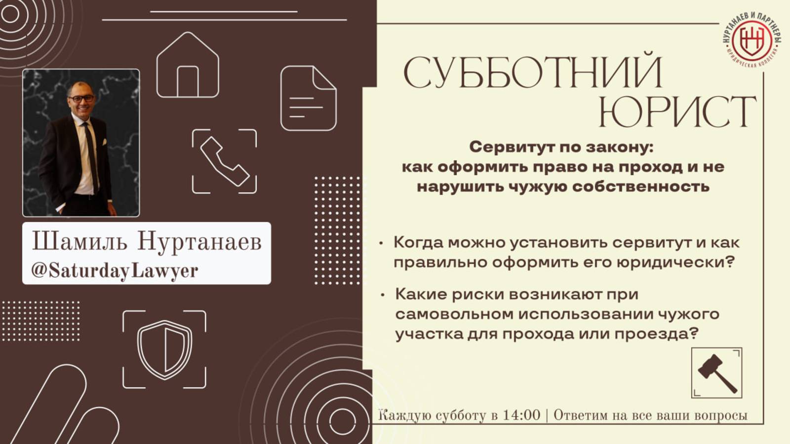Друзья, каждую субботу в Telegram-канале "Субботний юрист" (https://t.me/SaturdayLawyer) мы проводим для вас увлекательнейшие трансляции, тема которой подбирается на основе ваших обращений в Юридическую коллегию "Нуртанаев и партнеры" Каждый из вас может задать вопрос нам на сайте или в соцсетях по ссылке: https://clck.ru/3ByDxh Также, вы можете просто связаться с нами по номеру +7(495)006-78-08, по вашему желанию ответы прозвучат прямом эфире Скорее подписывайтесь, чтобы не пропустить следующую трансляцию: https://t.me/SaturdayLawyer