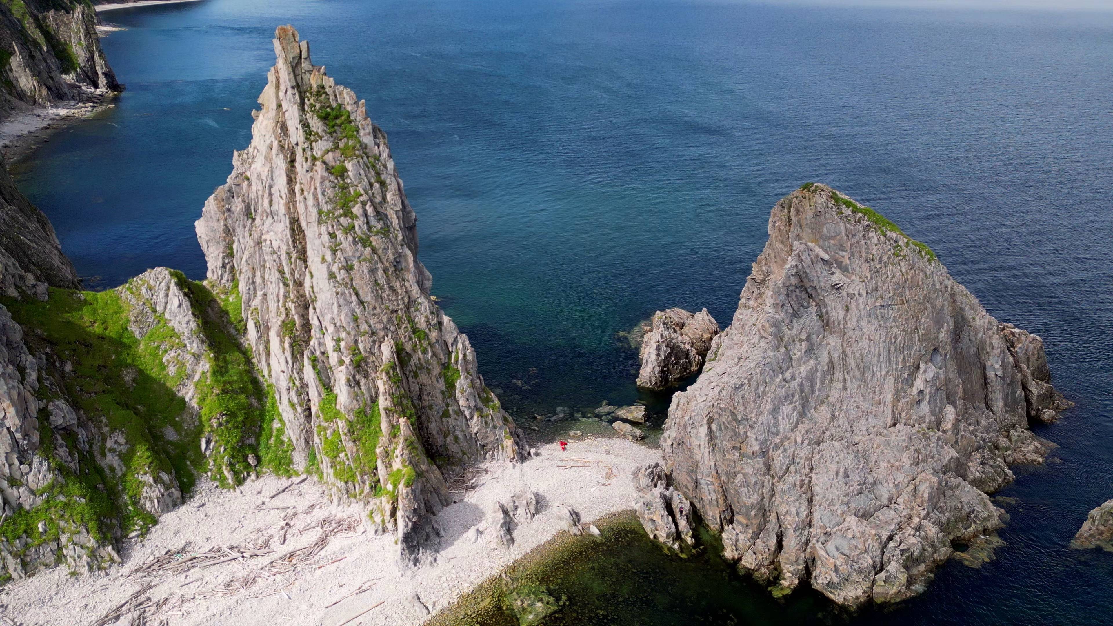 Раннее пробуждение. В палатке непонятно, что небо красное. Открываешь дверь, через тамбур можно догадаться, но тоже мутно и неточно. В общем, такие ранние подъёмы раньше будильников не просто так... значит, что-то зовёт меня... Прекрасный рассвет, но сидеть и просто смотреть никак не получится... ещё столько дел. И по плану пройти 34-40 км, а я вчера устал, проплыв 27 км. По карте я насмотрел, что ближайшее место для ночёвки в 34 км от дальней точки пляжа Ланге. По карте там везде скалы и короткий берег, а на Охотском море приливы до 2 метров, смоет с любого берега у скал (такое у меня было представление). Забегу вперёд: 3-4 места для ночёвки за первые 20 км я встретил точно, дальше 14 км — ещё 3-4 места для ночёвки. Конечно, надо понимать, что иногда отвесные скалы над головой, и всякое бывает, но я ночевал так около 4 ночей. Пытаемся понять, какая порода чаще осыпается по тем местам, где уже осыпалась она. И ещё: чем ниже высота скалистой стены, тем безопаснее. Время тикает, я бегаю, одним глазом смотрю на рассвет... Обычный набор задач: костёр, завтрак, собрать палатку, все-все-все вещи распихать в мой маленький каяк (5 м в длину и 66 см в ширину, и помним, что он не прямоугольный, так бы много что влезло, но по воде не скользил бы). Последнее — самое сложное... но после 15-го дня уже как по маслу залетало, может, что-то съел, что-то сгорело. 6:30 — ранний выход, плыву в тумане. По пути встречаются небольшие водопадики и птички (очковые чистики и топорки). Подходя к мысу Александра, тумана становится всё меньше, а синего неба больше. И вот в проливе между материком и островом Рейнеке совсем уже чистое небо, и солнце жарит, как летом. Напомню, что август на побережье Охотского моря больше похож на сентябрь на берегах Японского моря. И вот снова орланы летают над головой, и, конечно, мне надо поснимать эту величественную птицу... Какой размах крыльев, какая небесная грация! Выхожу на берег и запускаю свою птичку. Полёт белохвостого орлана, мыс Александра, укрытый лёгким туманом, и остров Рейнеке под плотным белым одеялом — всё это впечаталось на карте памяти навеки (даже морская вода не погубила эти кадры). 11:30. Я выдвигаюсь дальше. Впереди нас ждёт потрясающий воображение мыс Топографический с чудесными острыми скалами и водопадом прямо под боком. Проходя мыс, голова крутилась на все 360 градусов, слюни текли от наслаждения и предвкушения снять всё это. Один голос с правого плеча говорил, что надо плыть дальше: время идёт, день конечен, солнце зайдёт за горизонт, и где ты в этот момент будешь... Второй голос с левого плеча говорил, что ты тут ради этого: снимать всю эту красоту, любоваться ею и, в конечном итоге, рассказать всем про эту красоту и показать тем, кто отказывается верить твоим невероятным словам про эти чудесные места. А пока ангелы приводили свои аргументы, я повстречал СУЛОИ. Мне рассказывали про это явление и какое оно страшное. Но я встретил его в самой слабой форме, какая только возможна. То есть я одновременно и познакомился с ним, и довольно безопасно прошёл его. Если по морю волна была 10 см, то в этом месте волны были 30 см, они шли с разных сторон и раскачивали каяк. Я благодарил Бога и матушку-природу, что для меня был устроен такой мягкий урок. Моего воображения хватало, чтобы понять: если на море будет волна 60-70 см и более, то в такое место лучше не попадать. Ну а что касается
