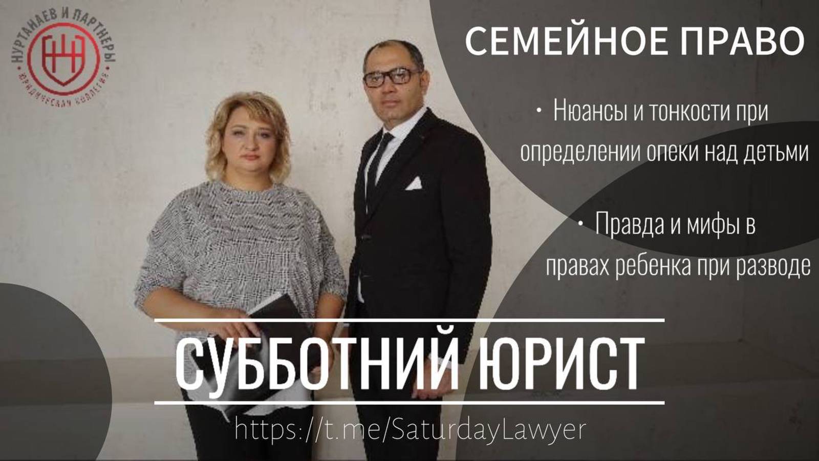 Друзья, каждую субботу в Telegram-канале "Субботний юрист" (https://t.me/SaturdayLawyer) мы проводим для вас увлекательнейшие трансляции, тема которой подбирается на основе ваших обращений в Юридическую коллегию "Нуртанаев и партнеры" Каждый из вас может задать вопрос нам на сайте или в соцсетях по ссылке: https://clck.ru/3ByDxh Также, вы можете просто связаться с нами по номеру +7(495)006-78-08, по вашему желанию ответы прозвучат прямом эфире Скорее подписывайтесь, чтобы не пропустить следующую трансляцию: https://t.me/SaturdayLawyer