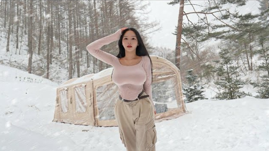 Кемпинг в снежный шторм люксовой 3-хкомнатной надувной палатке. ASMR видео.